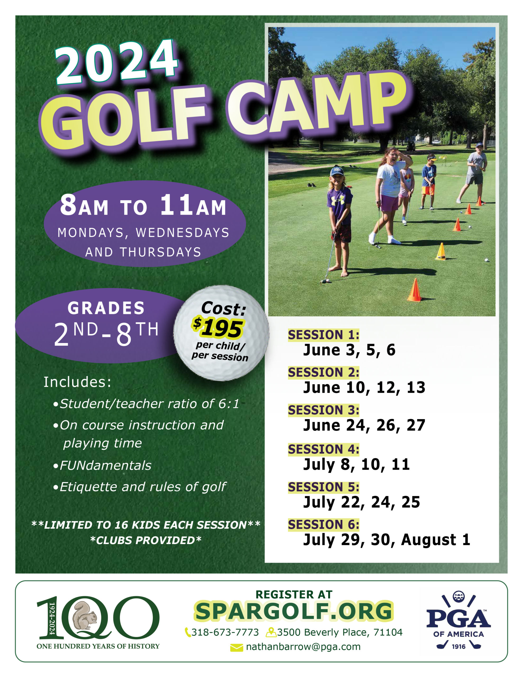 Featured August 1, 2024 @ 8:00 am - 11:00 am CDT Junior Camp Junior Camp (Session 6) Querbes Golf Course Register here: https://spargolf.org/2024-junior-camp-registration/